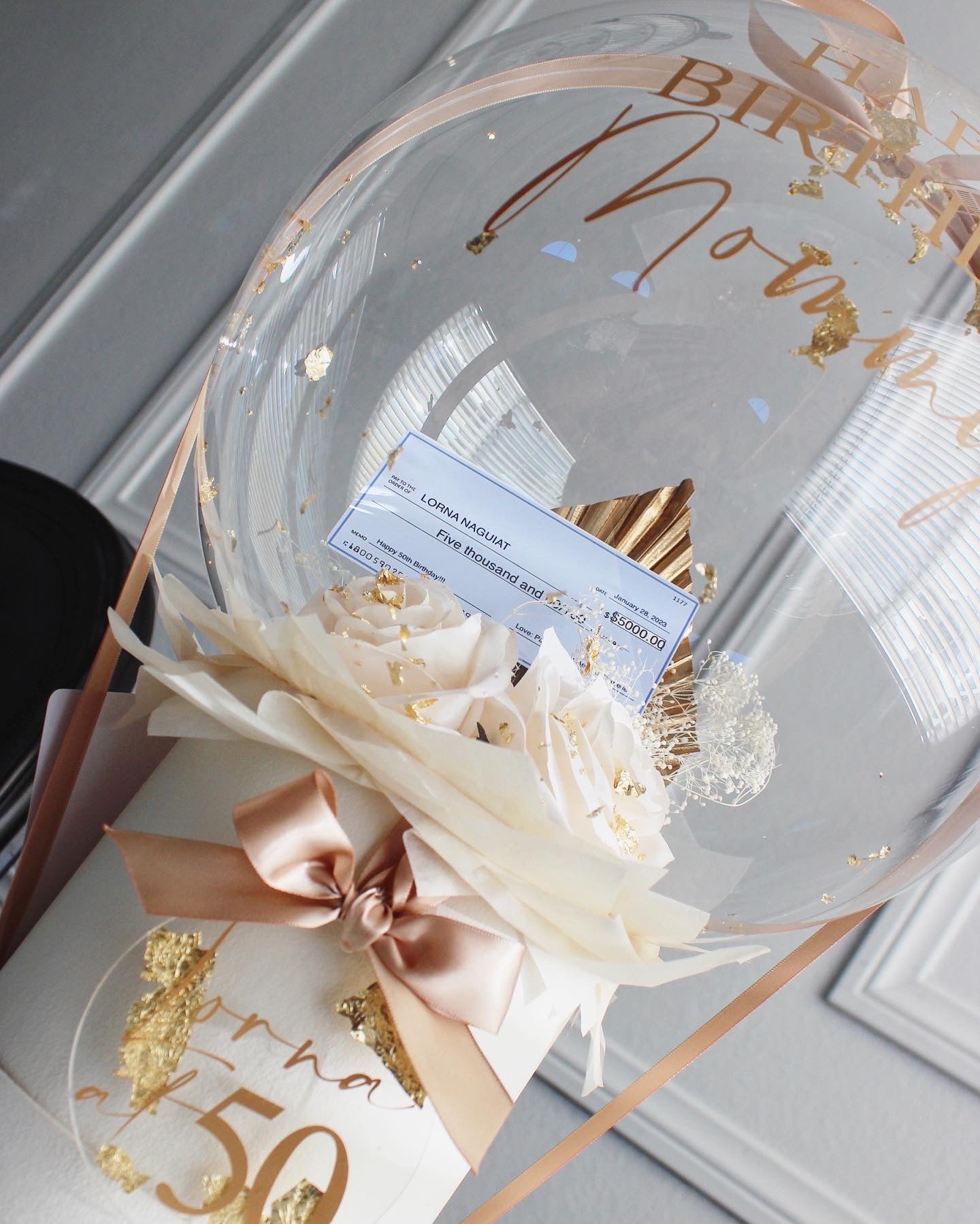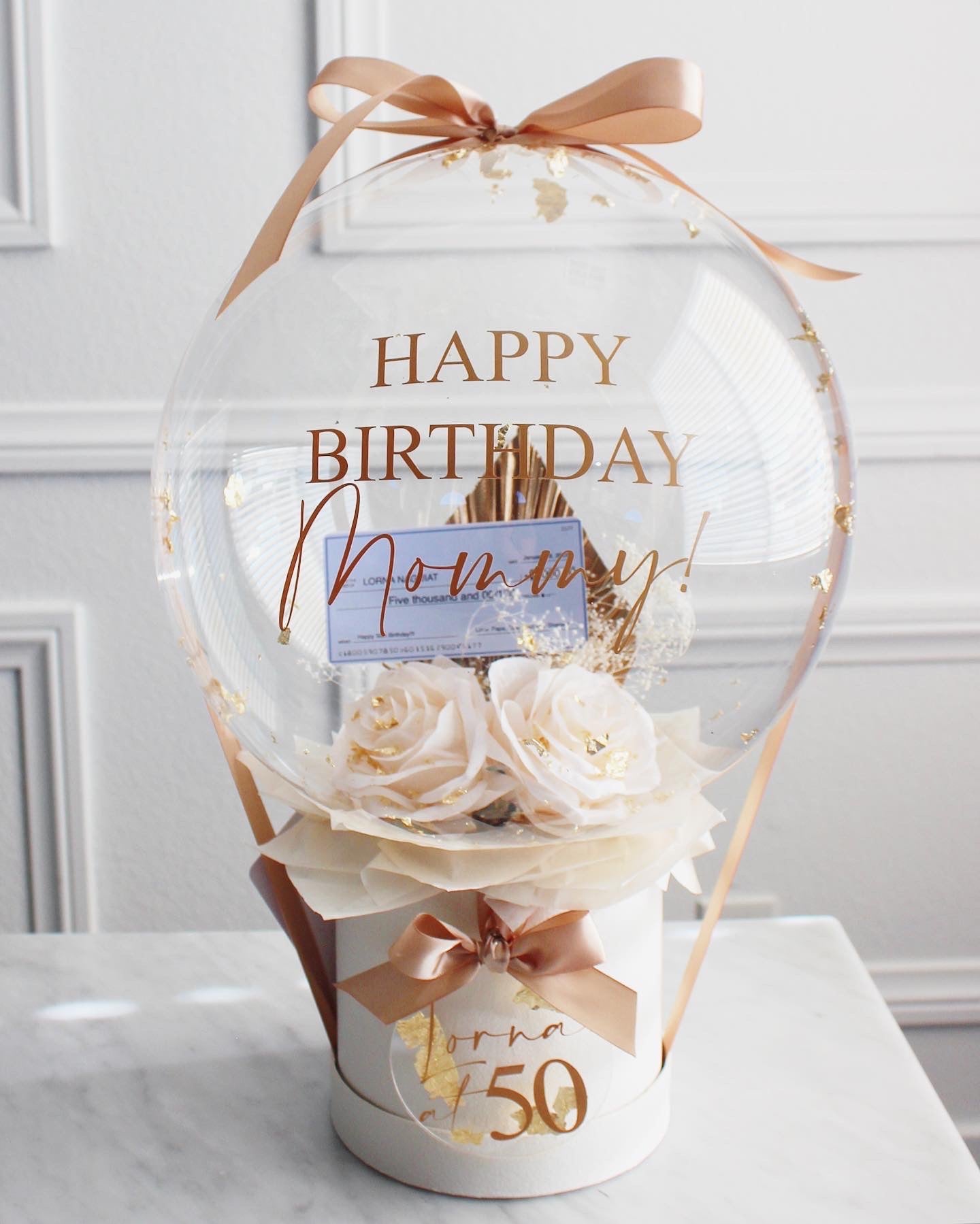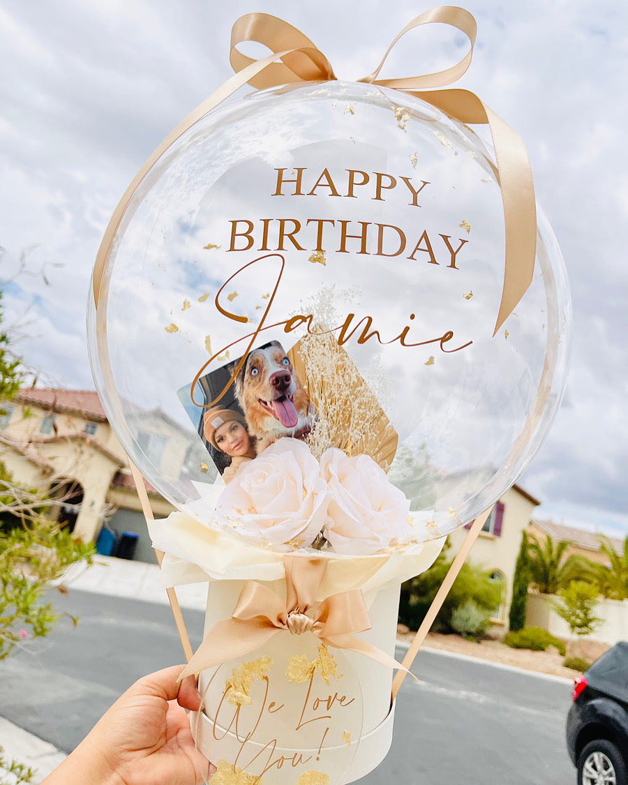 Balloon with high quality artificial roses, your photograph, dried leaf, stardust gypsophilia, natural bunny tails and flakes, ribbon, box, matching tissue paper, acrylic tag & custom message made of vinyl letters.