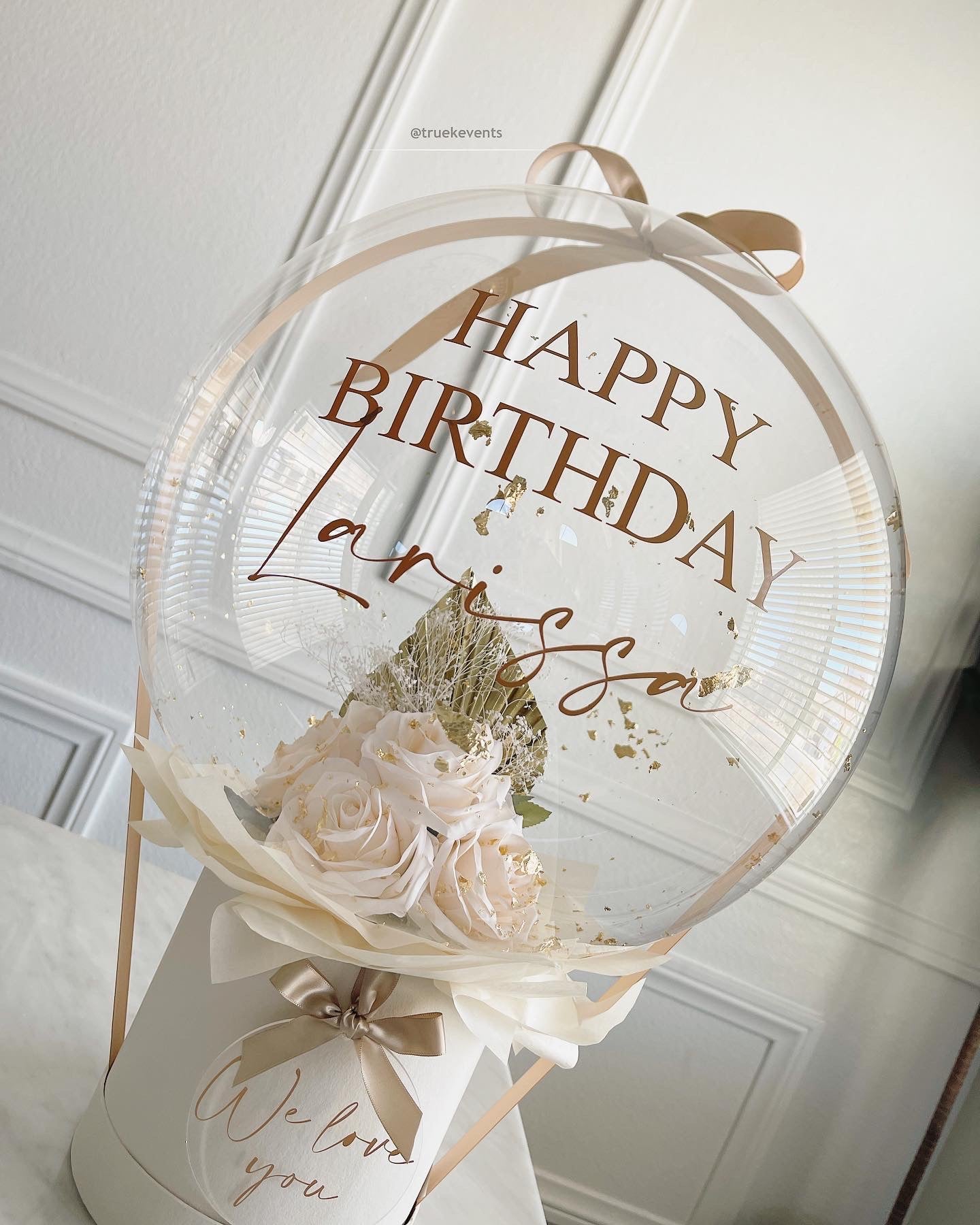 Balloon with high quality artificial roses, dried leaf, stardust gypsophilia, natural bunny tails and flakes, ribbon, box, matching tissue paper, acrylic tag & custom message made of vinyl letters.