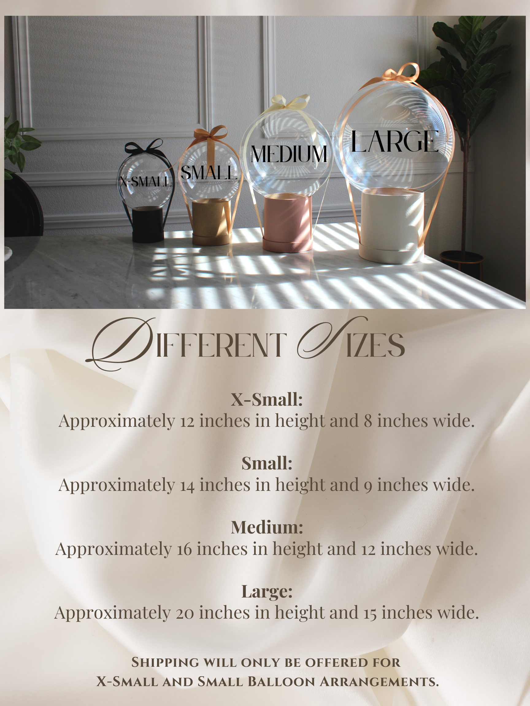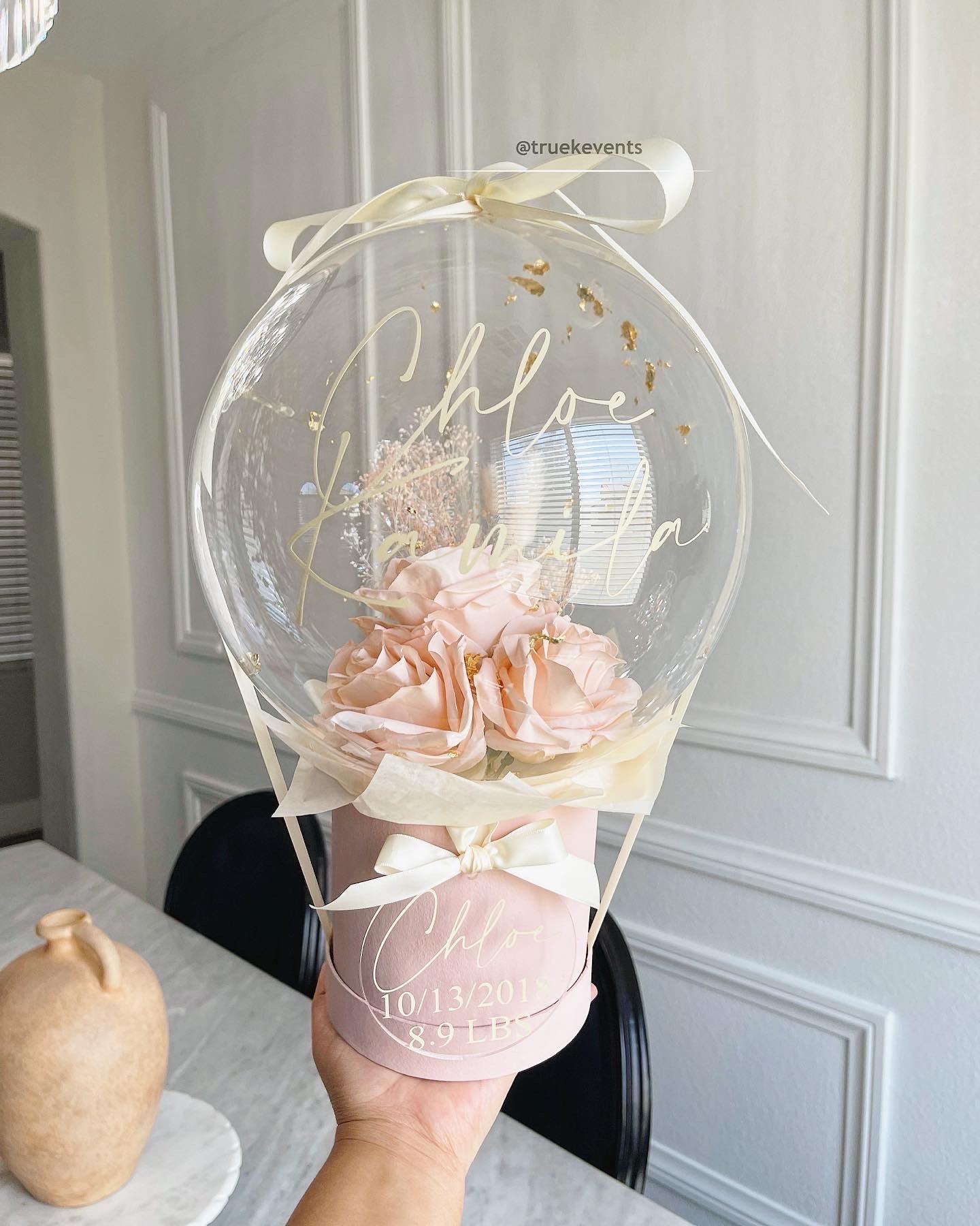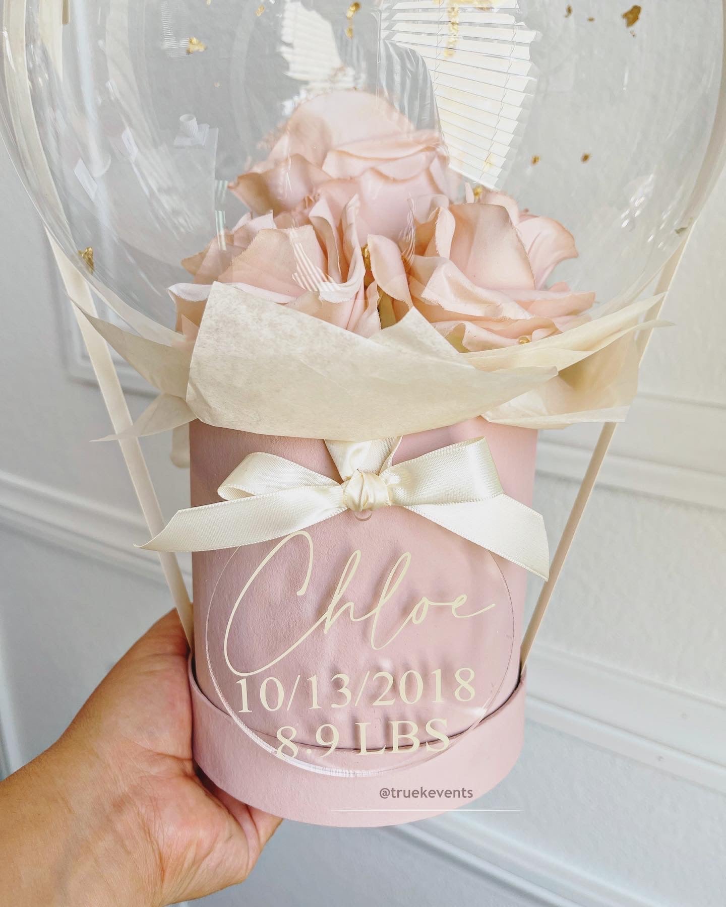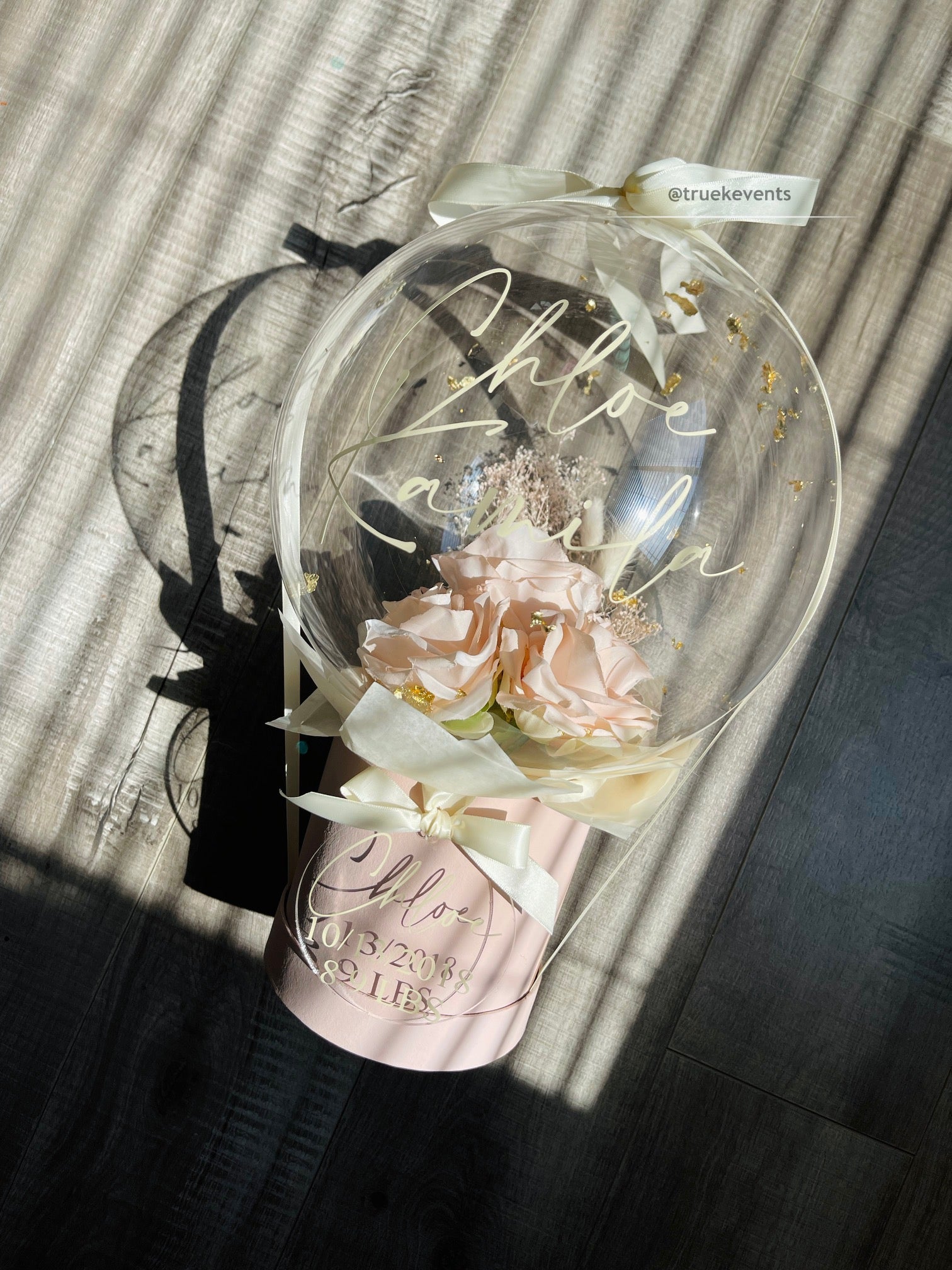 Balloon with high quality artificial roses, stardust gypsophilia, natural bunny tails and flakes, ribbon, box, matching tissue paper, acrylic tag & custom message made of vinyl letters.