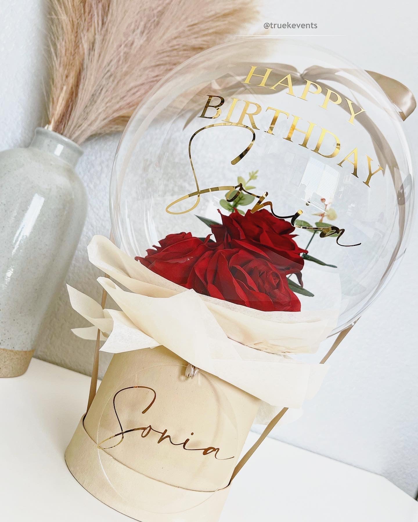 Balloon with high quality dark red artificial roses, box, ribbon, matching tissue paper, acrylic tag & custom message made of vinyl letters.